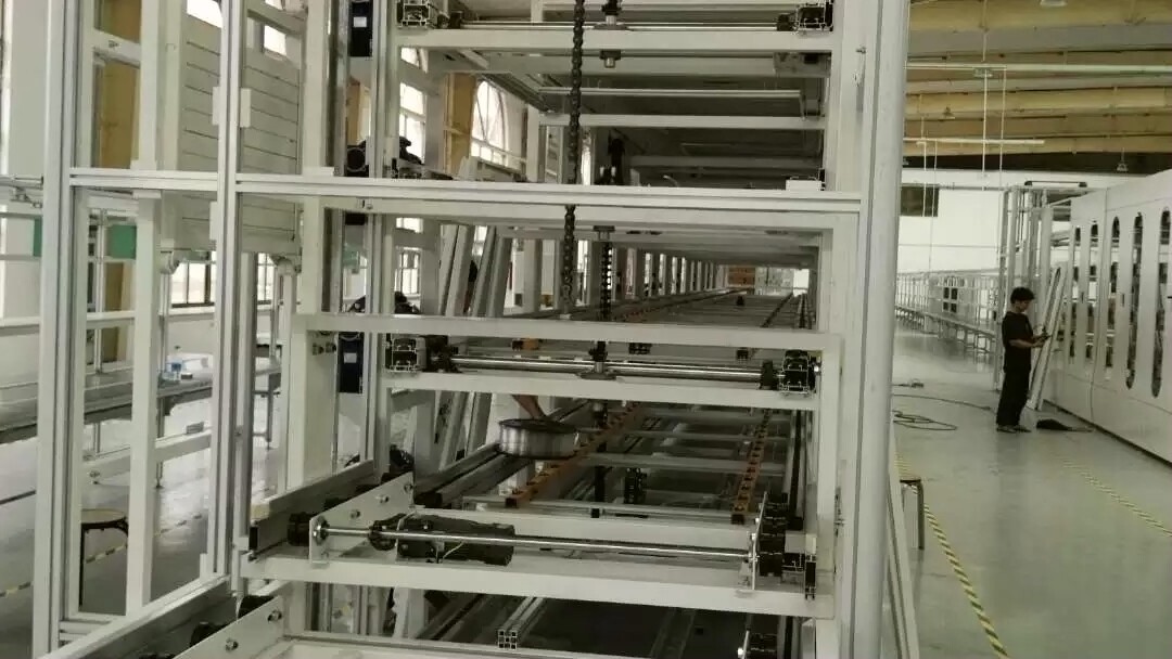 每层采用3条倍速链,中间增加一条倍速链支撑,很大的增加了工装板的支撑强度,工装板的承重也极大的提升了。